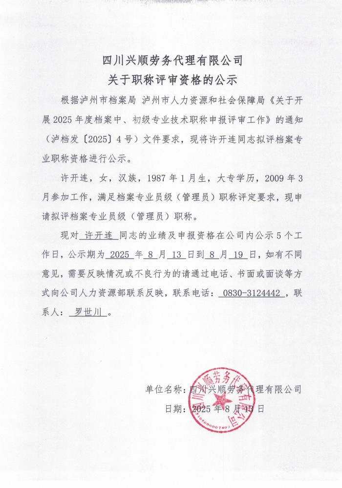 關于許開連申請擬評檔案專業(yè)員級(管理員)職稱的公示